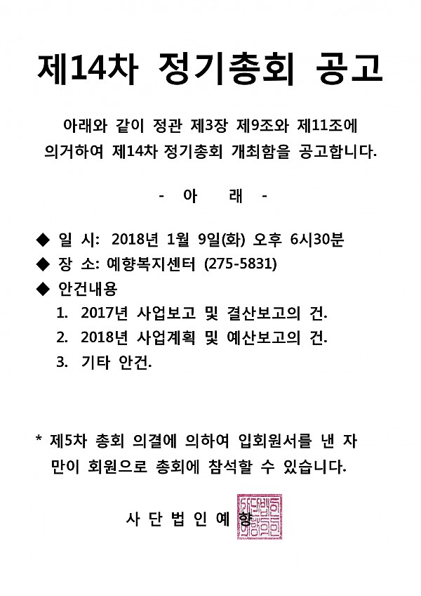 제14차 정기총회 공고 페이지 정보 작성자 예향 작성일2018-01-03 09:36 조회8,162회 댓글0건 이전글 다음글 목록 본문 댓글목록 등록된 댓글이 없습니다. 이전글 다음글 목록